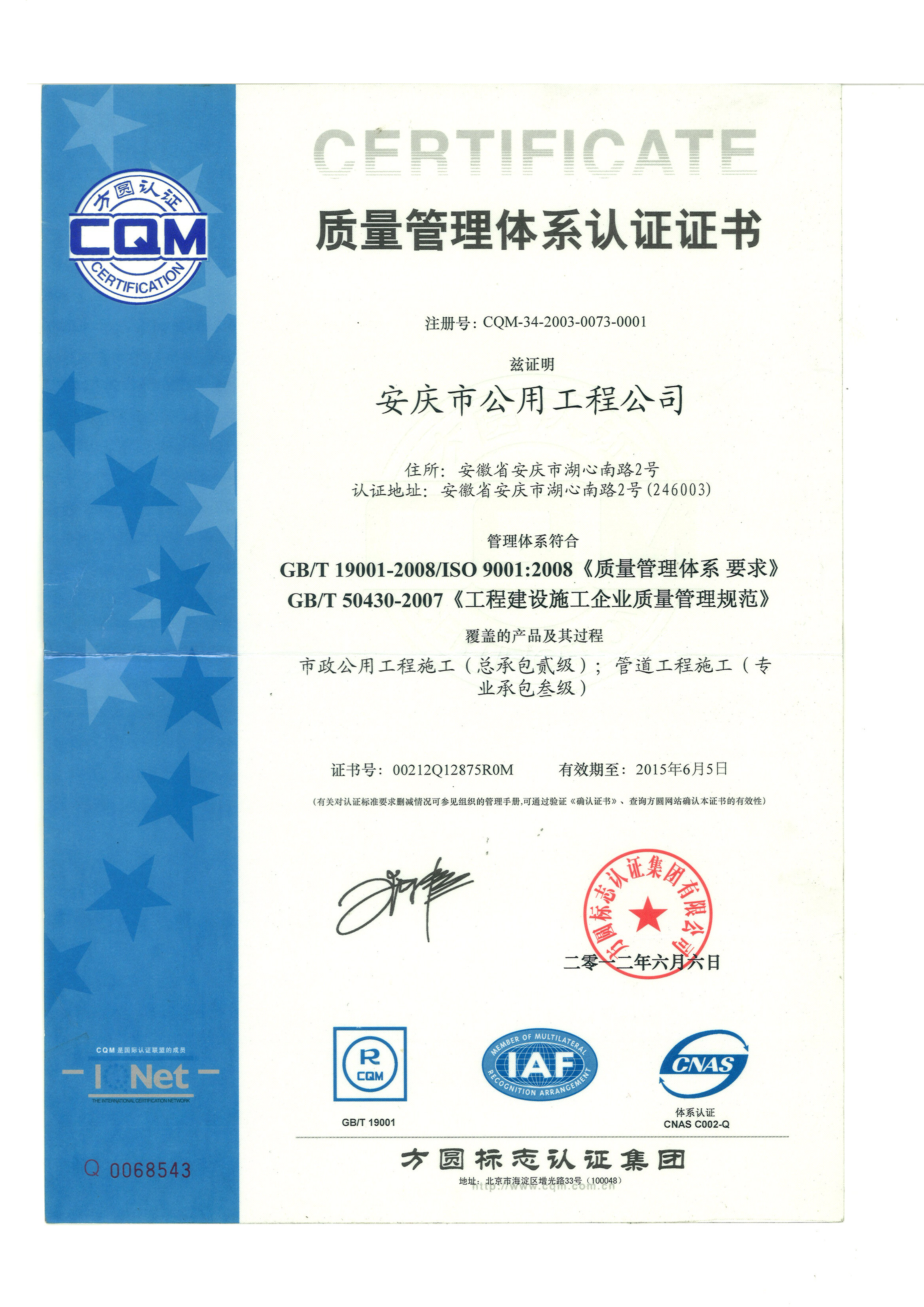 質(zhì)量管理體系證書(shū)